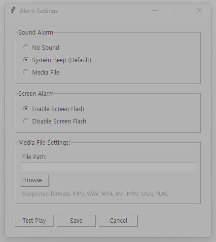 Choose your alert type: system beep, media file(MP3, WAV, MP4, AVI, MKV, OGG, FLAC) or screen flash. Never miss important screen changes.